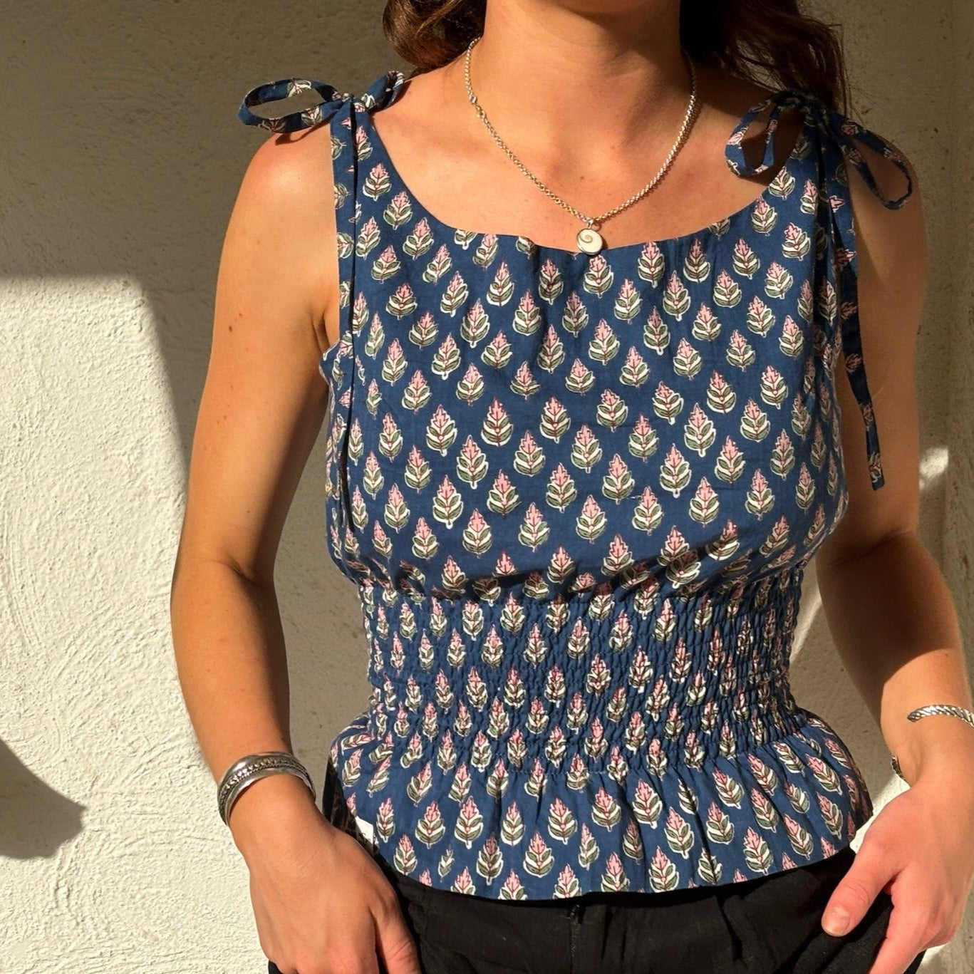 Meet the Luna top - our signature tie-shoulder design in a stunning blue and pink fabric.